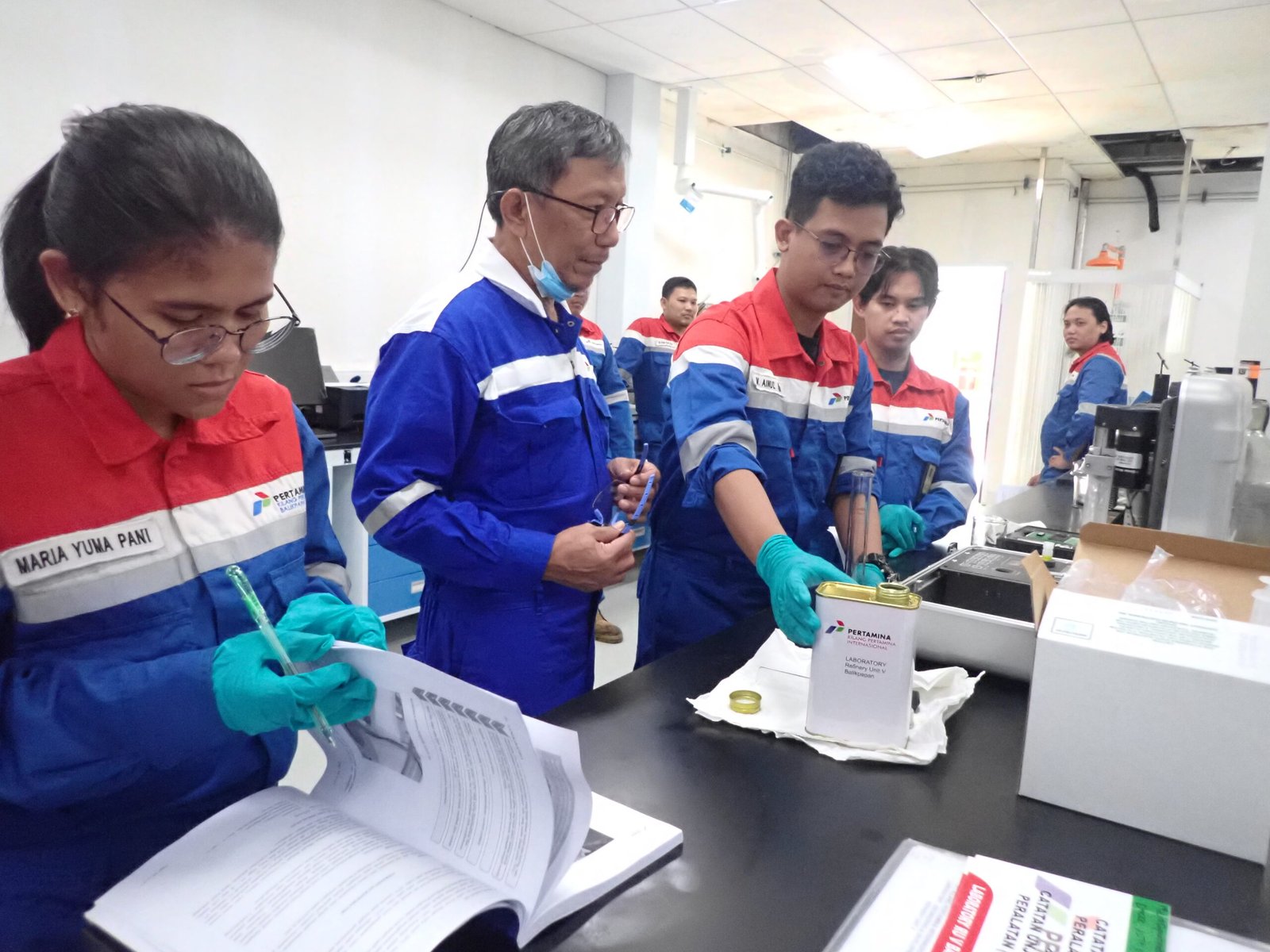 - Ujian PraktikUjian praktik dilakukan langsung di Kilang RU V Balikpapan, tempat peserta menunjukkan kemampuan nyata dalam pengambilan sampel BBM aviasi, penggunaan alat ukur, serta penerapan SOP pengujian secara langsung di lingkungan operasional.